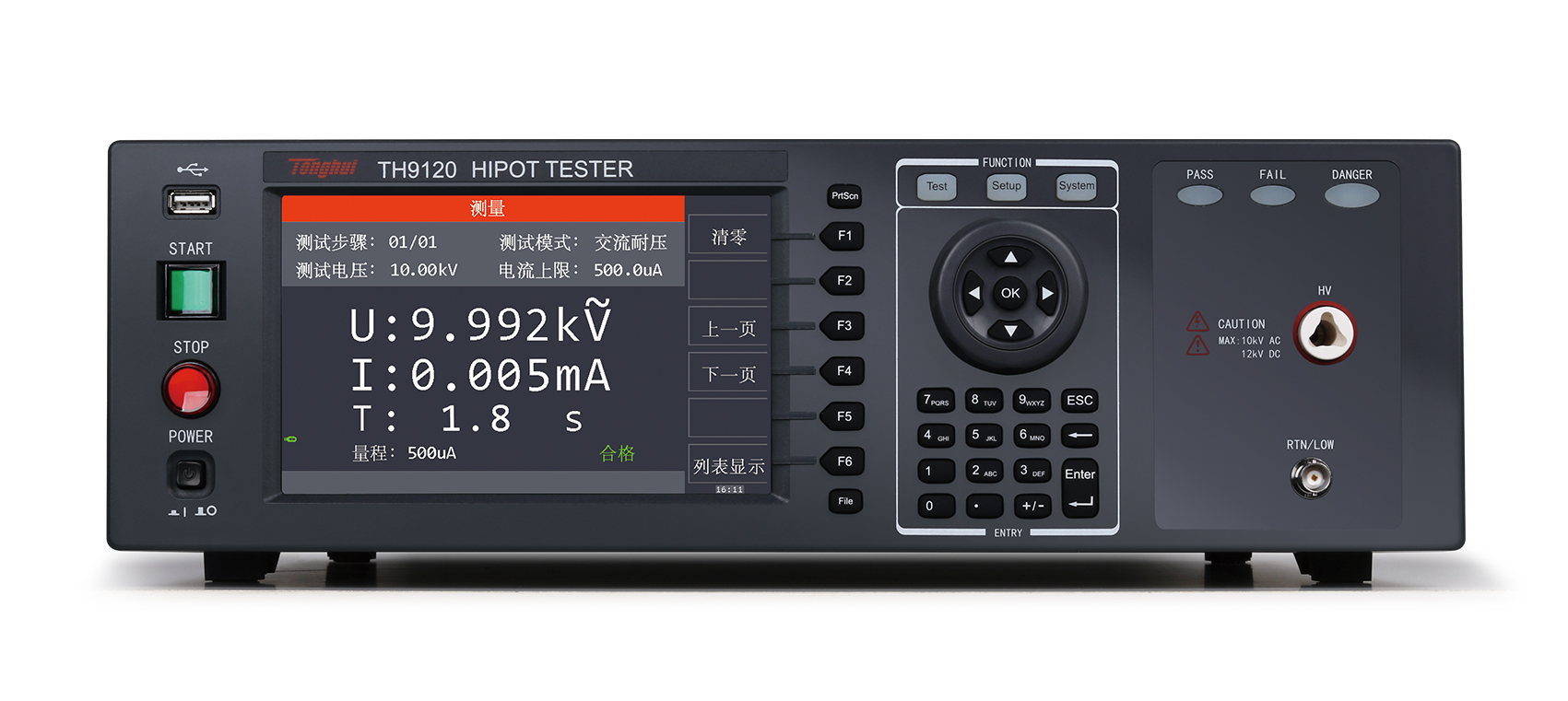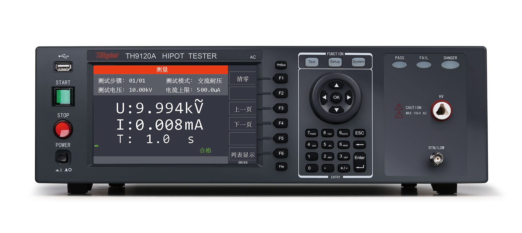 在耐壓測試方面,輸出功率 AC:200VA(10kV/20mA),DC:120VA(12kV/10mA),因此可用來為高耐壓的定子、電機等設備做耐壓測試,也可以對零件做同樣的測試。在絕緣電阻測試方面,所能顯示范圍為 0.1MΩ- 50GΩ,測試電壓為 50V-5000V 可任意設定。在開短路檢測測試方面,可在進行高壓測試前,先判斷被測件是否可靠連接,再進行高壓測試。在顯示方面,所有的測試模式、時間、電壓、電流、電阻值、測試步驟等都在顯示器上顯示,另有列表顯示模式,顯示多步驟的設置及順序測試結果。